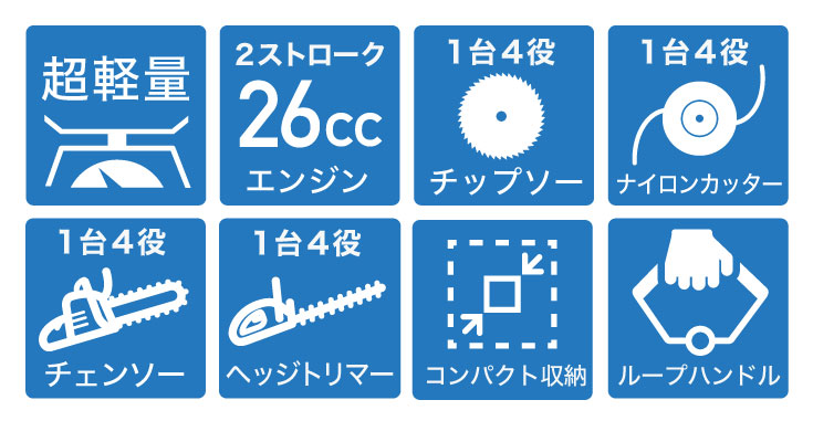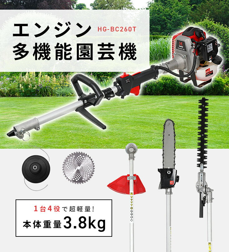 エンジン式 多機能園芸機(チップソー/ナイロンカッター/チェンソー/ヘッジトリマー)1台4役 2ストローク26ccエンジン [高枝切り 垣根 生垣 庭 芝生 休耕田 雑草 刈払機 剪定 草刈機 バリカン チェーンソー]/HG-BC260T【1年保証】
