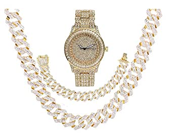 【送料無料】腕時計 メンズアイスヒップホップゴールドトレンディブリングメタルウォッチネックレスセット