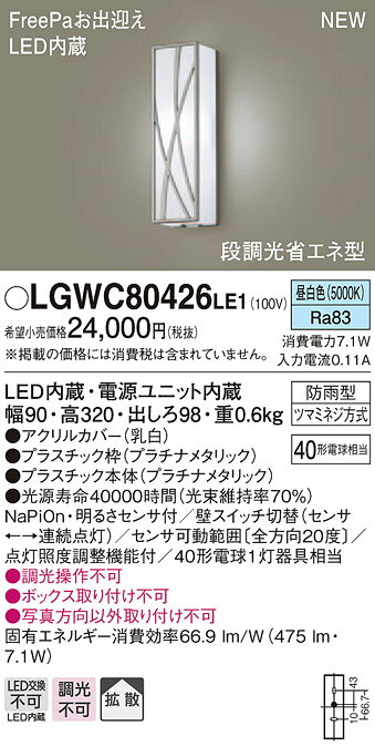 商 品 詳 細商品名パナソニック エクステリアライトメーカー名パナソニック Panasonicメーカー器具名称エクステリアライト ブラケットライト ポーチライト(玄関廻り)仕様◆LED(昼白色タイプ) ◆光源色温度:5000 K ◆光源寿命40000時間(光束維持率70%)◆幅:90 mm ◆高:320 mm ◆出しろ:98 mm ◆質量:0.6 kg◆器具光束:475 lm ◆電圧:100 V ◆消費電力:7.1 W ◆消費効率:66.9 lm/W◆デザイン分類:Natural◆【アクリルカバー】乳白◆【プラスチック枠】プラチナメタリック◆【プラスチック本体】プラチナメタリック◆Ra83◆NaPiOn・明るさセンサ付◆壁スイッチ切替(センサ←→連続点灯)◆センサ可動範囲〔全方向20度〕◆点灯照度調整機能付◆40形電球1灯器具相当◆入力電流(100V時):0.11 A◆調光操作不可◆ボックス取り付け不可◆写真方向以外取り付け不可注意事項◆写真方向以外取り付け不可 ※施工・電気工事は専門業者にご依頼ください。