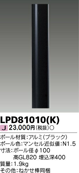メーカー: TOSHIBA /東芝ライテック アルミ(ブラック) ポール径φ100 高GL820 質量1.9kg 【適合灯具】 LEDG88913(K) LEDG88908(K) LEDG88906(K) LEDG88904(K) LEDG88912(K) LEDG88911 LEDG88910 【適合ランプ】 LED電球40W形相当・60W形相当 (灯具組合せ時)GL:約1,000mmタイプ 器具周囲から100mm以上離して取付 ねかせ棒同梱 屋外(雨線外) ※取付工事が必要です。