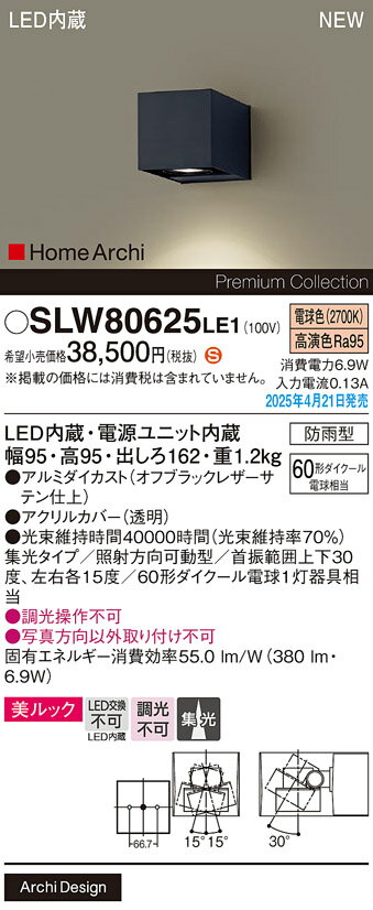 商 品 詳 細商品名パナソニック エクステリアライトメーカー名パナソニック Panasonicメーカー器具名称エクステリアライト ブラケットライト ポーチライト光源◆LED(高演色・電球色タイプ) ◆色温度:2700 K ◆光源寿命40000時間(光束維持率70%)寸法・質量◆幅:95 mm ◆高:95 mm ◆出しろ:162 mm◆質量:1.2 kg仕様◆器具光束:380 lm ◆電圧:100 V ◆消費電力:6.9 W ◆消費効率:55 lm/W◆デザイン分類:Stylish Modern◆【アルミダイカスト】ブラックレザーサテン仕上◆【アクリルカバー】透明◆高演色Ra95◆集光タイプ◆照射方向可動型◆首振範囲上下30度、左右各15度◆60形ダイクール電球1灯器具相当◆入力電流(100V時):0.13 A◆調光操作不可◆写真方向以外取り付け不可注意事項◆調光操作不可 ◆写真方向以外取り付け不可 ※施工・電気工事は専門業者にご依頼ください。