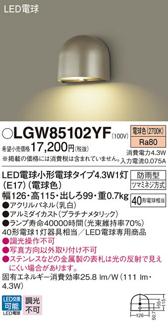 商 品 詳 細商品名パナソニック エクステリアライトメーカー名パナソニック Panasonicメーカー器具名称門灯(門柱・門袖灯)光源◆LED電球小形電球タイプ3.4W1灯(E17)(電球色) ◆光源色温度:2700 K ◆光源寿命40000時間(光束維持率70%)寸法・質量◆幅:126 mm ◆高:115 mm ◆出しろ:99 mm ◆質量:0.7 kg仕様◆器具光束:91 lm ◆電圧:100 V ◆消費電力:3.4 W ◆消費効率:26.7 lm/W ◆デザイン分類:Stylish Modern Casual ◆【アクリルパネル】乳白 ◆【アルミダイカスト】プラチナメタリック ◆Ra80 ◆40形電球1灯器具相当 ◆LED電球専用商品 ◆入力電流(100V時):0.06 A ◆調光操作不可 ◆写真方向以外取り付け不可 ◆ステンレスなどの金属製の表札は光の反射で見えにくい場合があります。
