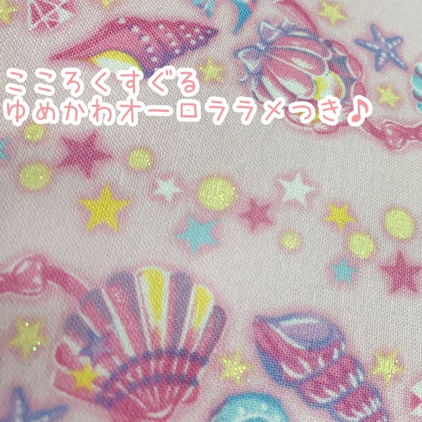 ユメカワイイグラデーションで描かれた、様々な貝殻がかわいいもの好きな方にたまらないデザイン! 生地の泡玉(ドット)の部分や星の部分にはオーロラの虹色に輝くラメのやや珍しい特殊な加工付きです。