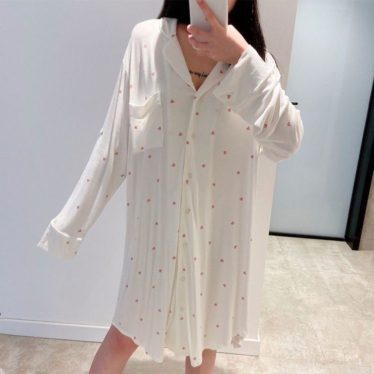 ゆったり着られるシンプルな前開きワンピースルームウエアです。