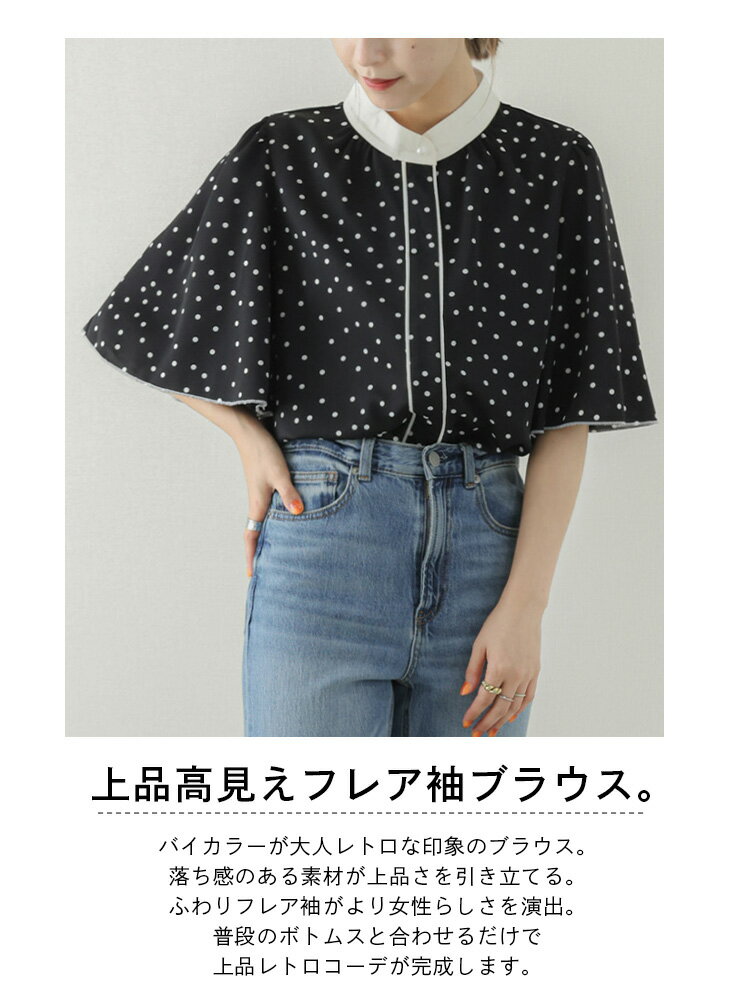 【クーポン利用で1580円】ブラウス フレア袖 バイカラー 5分袖 トップス 上品 レトロ レディース おすすめ おしゃれ ブラック メール便 2022春夏新作 【lstp205-811】【即納:1-5営業日】【送料無料】ヤ込1