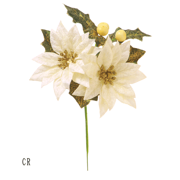 【商品サイズ】 全長:約16cm 全体径10cm 花径:約7cm リーフ:約3.5〜5.5cm ステム部分:約10cm 材質:ポリエステルポインセチアとホーリーリーフのミックスピックゴールドのみ金色の糸を織り込んだ生地素材で ゴールド以外はベルベット風の生地になっています。