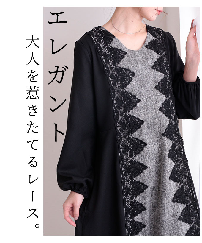 レースあしらう切替ロングワンピース レディース ファッション ワンピース ブラック 黒 ロング丈 長袖 秋 冬 バイカラー 異素材 M L Mサイズ Lサイズ 9号 サワアラモード アラモード sawaalamode 可愛い服 otona kawaii かわいい服 かわいい 可愛い