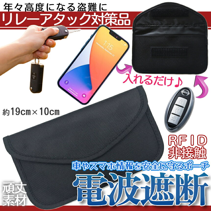 【商品説明】 iPhoneなど携帯を入れるだけで Wi-FiやBLUETOUTHなどスマートフォンの 様々な通信機能も遮断できるポーチ ・iPhoneや各種スマホに対応!!! ・電源はONのままでOK!!! ・外ポケットは電波の遮断はできませんが 切符や入場券入れなどに使えます!!! 強固な盗難防止システムを持つ最新型車でもドアロックは瞬間に空き! 新たな車の盗難方法「リレーアタック」から愛車を守りましょう♪