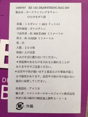 【商品説明】 製品名:カークランドシグネチャー ひも付きポリ袋 枚数:200枚 容量:49L/1枚 サイズ:60cm x 68cm カラー:白 原産国名:アメリカ 輸入者:コストコホールセールジャパン株式会社 ※ご使用の際は、取り扱い上の注意をお読みになりご使用ください。