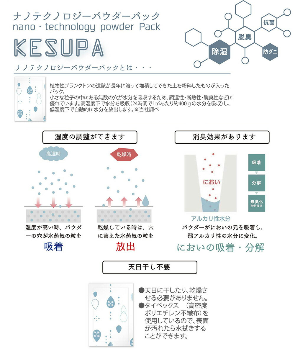 ■材質:本体:珪藻土・消石灰 パック:高密度ポリエチレン不織布・多孔質フィルム内容量:(約)10g 有効期間:開封後約3か月■規格本体:(約)幅7×奥行0.3×高さ10cm■生産国:日本■ご使用にあたっての注意事項・ご使用上の注意を必ずお読みいただき、正しくお使いください。